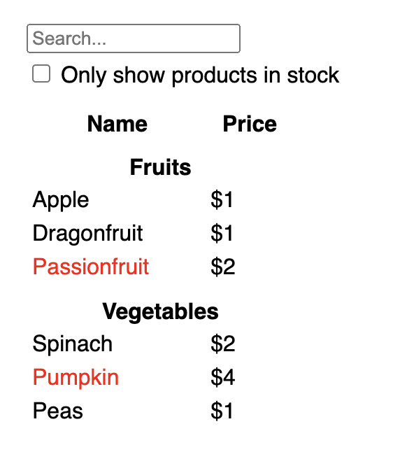 Then, pass filterText and inStockOnly to ProductTable and SearchBar as props: